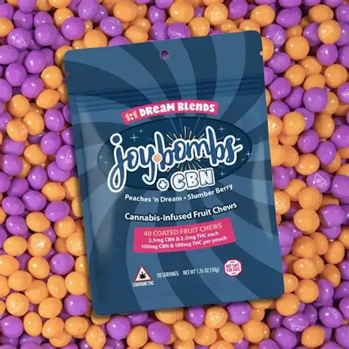 Joy Bombs + CBN 1:1 Dream Blends come in a sweet mix of two deliciously snoozy fruit flavors: Peaches ’n Dream and Slumber Berry, each with a CBN boost! Joy Bombs’ signature sugary shell means they'll melt in your mind, but not in your purse or pocket.
