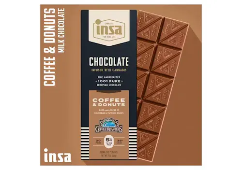 From INSA - "Our delightfully smooth milk chocolate is blended with Shelburne Falls Coffee Roasters' espresso and Colombian roasts. We took it to the next level by adding natural donut flavors, a finishing sprinkle of cinnamon sugar, and 5mg of THC per piece. The taste reminds us of our favorite coffee shop—robust, bold coffee notes paired perfectly with freshly made donuts. This limited edition flavor won't last long—get it while you can!"